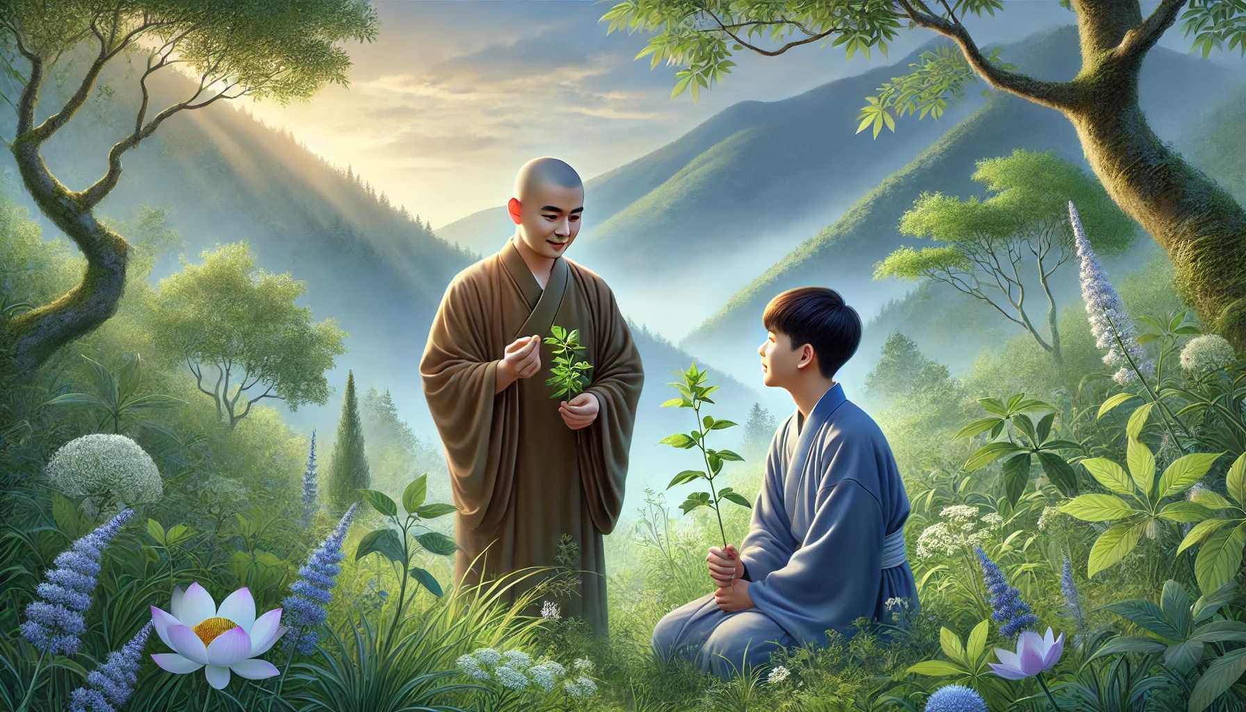 石头禅师通过倾听泉声让弟子体会修行的宁静。