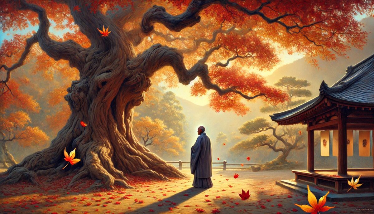 修行如秋叶飘零,顺应自然,不执着于任何形式,回归本性的宁静。