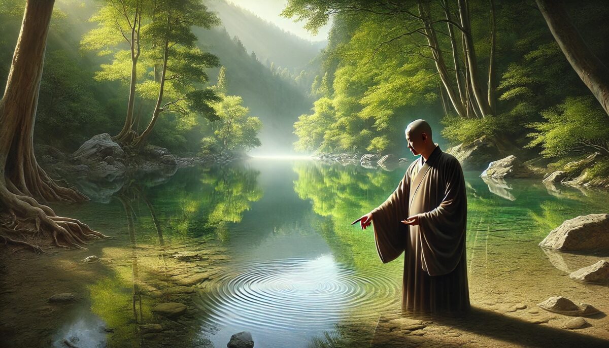 修行的心境如深潭,内心清净无执,方能映现真实,不为外界所扰。