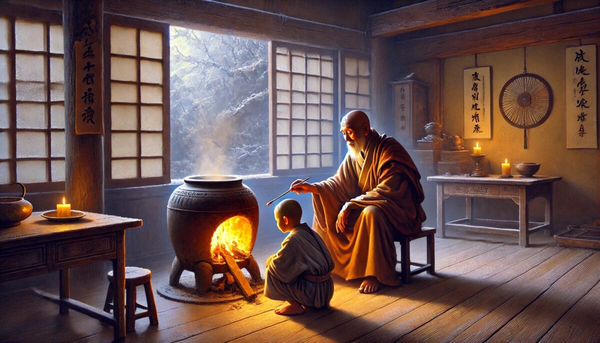 云门禅师通过冬日取暖的柴火教化众生修行的恒心。