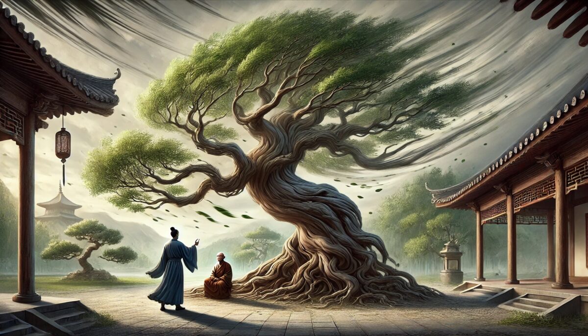 慧能禅师通过风吹大树的现象教化弟子修行中的坚韧。