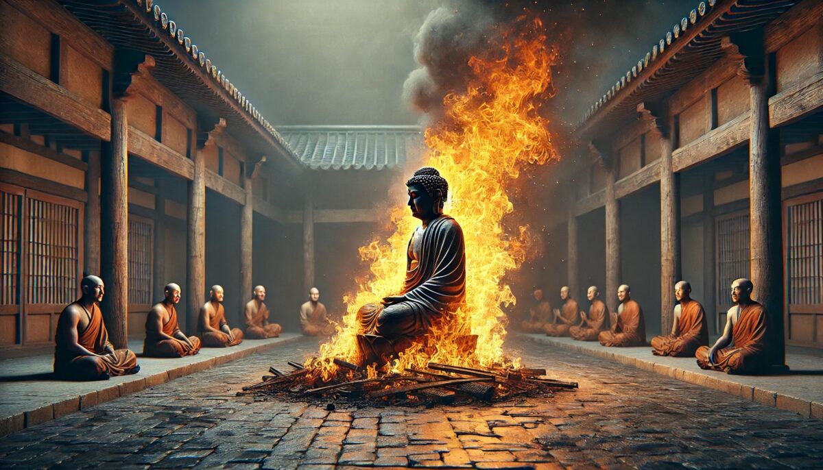 烧佛像 ussomc10Jan 2, 2025Jan 23, 2025 烧佛像 背景: 南泉禅师通过极端行为考验弟子的觉悟。 故事内容: 一天,弟子见南泉正在烧一尊木制的佛像,惊呼:“师父,怎么能烧佛像?” 南泉答:“冷了,拿它取暖。” 弟子追问:“这可是佛像啊!” 南泉说:“你若执着于木头佛像,便永远见不到真正的佛性。” 禅意: 佛性超越一切形式,执着于形象或物质,只会遮蔽觉悟的本质。 Post Views: 111 <span class="nav-subtitle screen-reader-text">Page</span> Previous Post桥上不走Next Post桥与水 Related Posts 一字禅 云门禅师用一个字回答修行的奥义。 ussomc10Jan 12, 2025 无念 慧可禅师用日常经验启发弟子。 ussomc10Jan 12, 2025 树上安住 鸟巢禅师用自己的生活方式比喻心的安定。 ussomc10Jan 12, 2025Jan 20, 2025