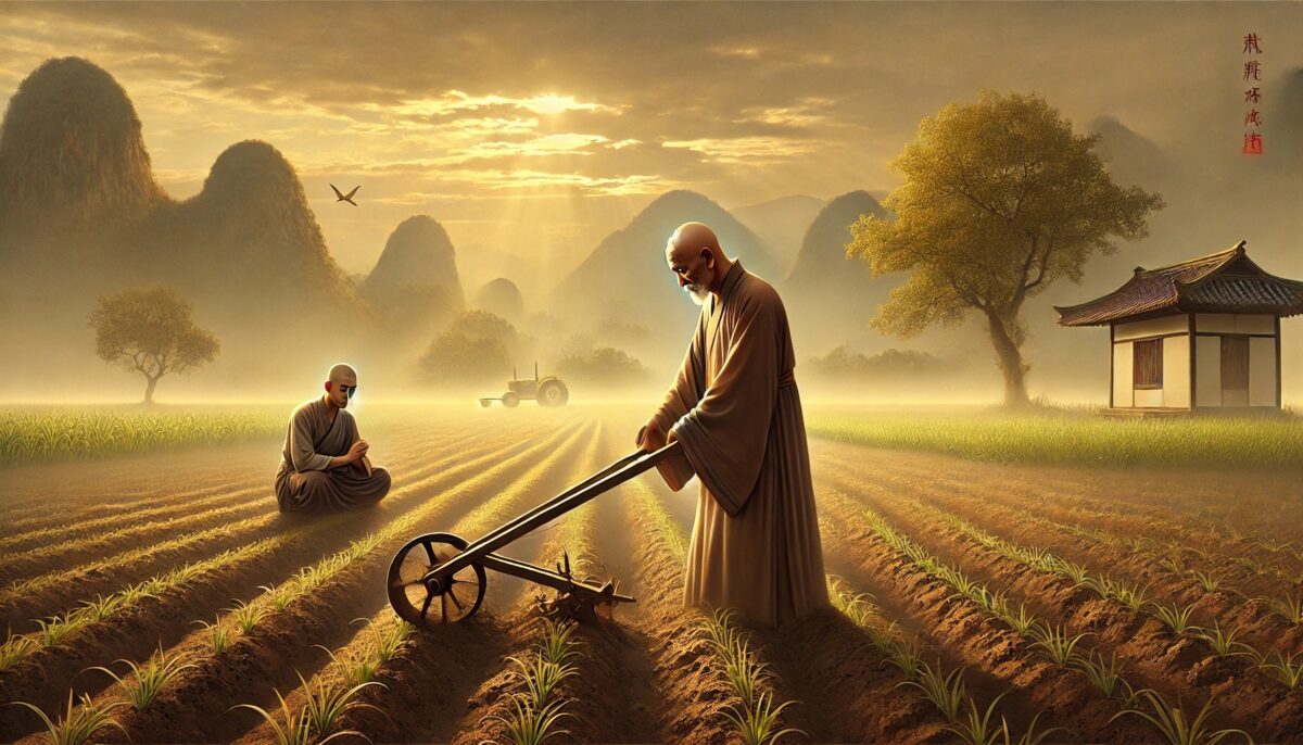 慧能禅师用翻地种田的场景教化弟子修行的根本。