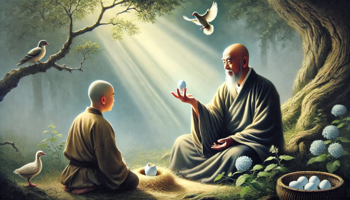 鸡蛋里的道理 ussomc10Jan 9, 2025 鸡蛋里的道理 背景: 慧能禅师用鸡蛋的比喻教化弟子修行中的突破。 故事内容: 弟子问慧能:“师父,修行为何总感觉被困?” 慧能递给他一个鸡蛋,问:“小鸡如何出壳?” 弟子答:“啄破蛋壳。” 慧能说:“你的觉悟也如小鸡,突破束缚,才见天光。” 禅意: 修行如破壳,唯有突破自我的限制,才能看到更广阔的世界。 Post Views: 70 <span class="nav-subtitle screen-reader-text">Page</span> Previous Post禅师的木鱼 Next Post倒立的树 Related Posts 我是谁 云门禅师用幽默的回答打破弟子的思维局限。 ussomc10Jan 18, 2025 风吹竹 慧能禅师用自然景象教导弟子无为而安。 ussomc10Jan 18, 2025 走路与修行 临济通过生活中的小事揭示修行的真谛。 ussomc10Jan 18, 2025