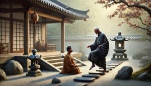 见瓦片滑悟道 ussomc10Jan 12, 2025 见瓦片滑悟道 背景: 百丈怀海禅师因日常小事领悟佛法。 故事内容: 百丈禅师在山间扫地时,看到一片瓦片从山坡滑下,顺着地势滚动。 他突然醒悟:“修行如这瓦片,顺其自然,无需强求。” 他当即写下偈语:“一滑即千丈,顿入不思议。” 禅意: 修行的关键是顺应因缘,不用刻意追求,随顺自然即是佛法。 Post Views: 79 <span class="nav-subtitle screen-reader-text">Page</span> Previous Post皮肉骨髓 Next Post一步入道 Related Posts 脚步悟道 临济通过脚步声让弟子顿悟。 ussomc10Jan 16, 2025 空钵子 德山禅师用空钵象征心的空性。 ussomc10Jan 16, 2025 一炷香 云门禅师用焚香的举动点化弟子。 ussomc10Jan 16, 2025