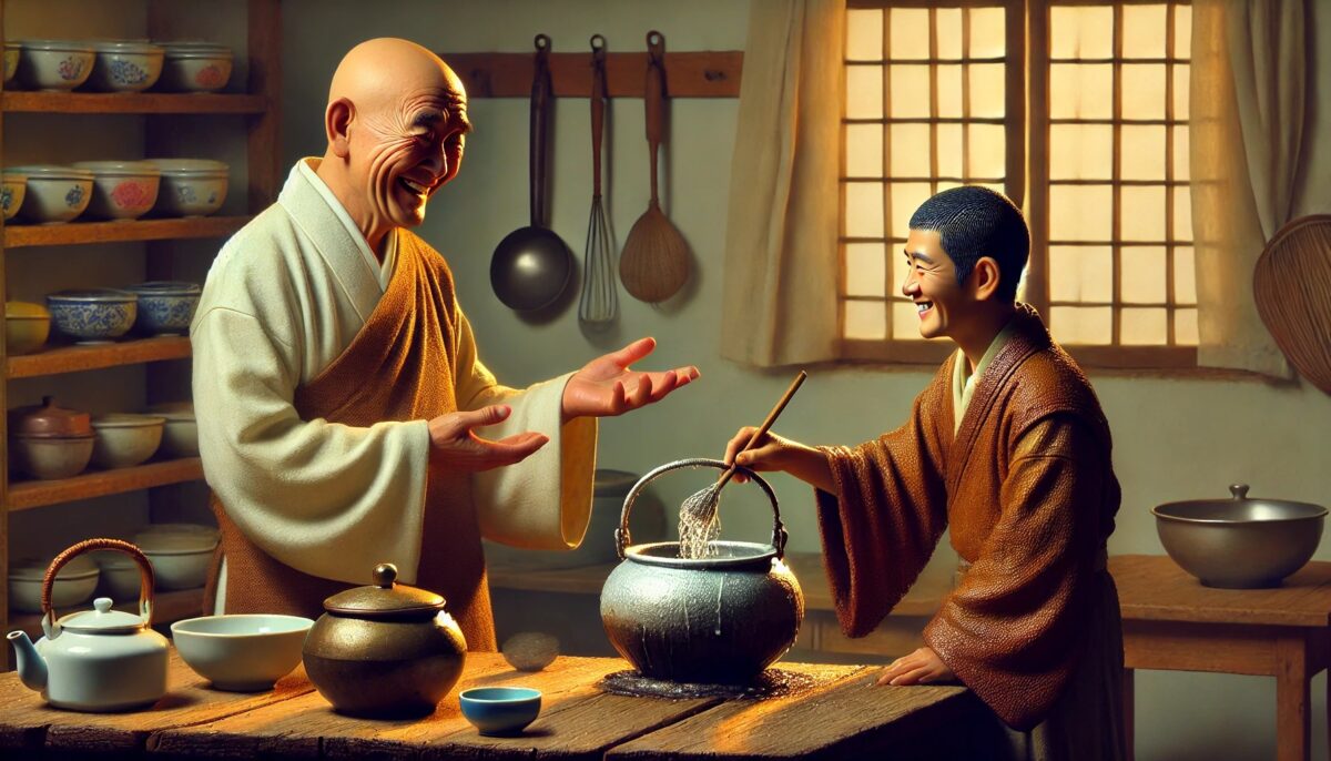新僧不解,但去洗了锅,发现锅里油垢满布,清洗后顿觉清净。