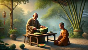 敲木鱼 ussomc10Jan 15, 2025 敲木鱼 背景: 慧能用木鱼的声音讲述修行的专注。 故事内容: 一日,慧能带弟子一起敲木鱼,他问弟子:“你听见了什么?” 弟子答:“听见了木鱼声。” 慧能笑道:“木鱼声来自敲击,修行如敲木鱼,专注一处,自有回响。” 禅意: 修行的重点在于专注,当心专注于当下,自会生起智慧的回响。 Post Views: 114 <span class="nav-subtitle screen-reader-text">Page</span> Previous Post米与饭Next Post切瓜悟道 Related Posts 鱼跃龙门 石头禅师用鱼跃龙门的象征解释修行的飞跃。 ussomc10Jan 18, 2025 滴水入海 黄檗禅师用水滴归海比喻修行的归一。 ussomc10Jan 18, 2025 雪中修行 慧可禅师用雪中禅坐的体验讲述修行的坚定。 ussomc10Jan 18, 2025