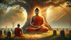 The Buddha, aware of Venerable Two Billion Ears’ thoughts, went to the cemetery to guide him. The Buddha asked him: