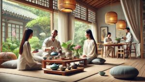 无论是桌面茶席还是地席,都要确保座位的舒适度。座位与茶器的高度需匹配,使泡茶与品茶的过程更加自然流畅。此外,光线柔和、通风良好的环境更适合长期品茶。
