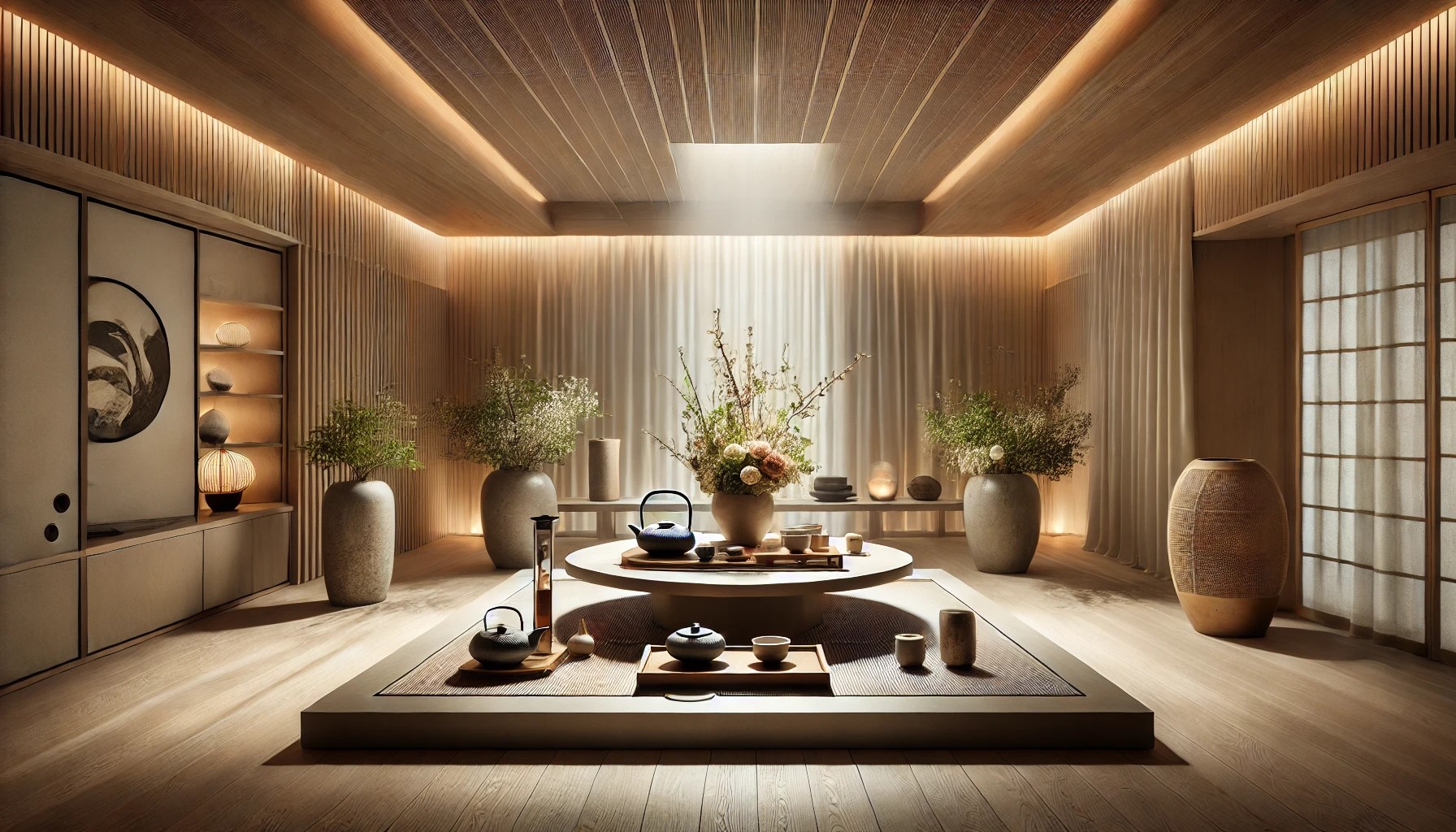 茶席布置:在茶席区域摆放陶瓷茶具、素雅茶垫,搭配花艺或香道,让空间更具层次感。