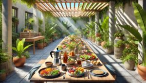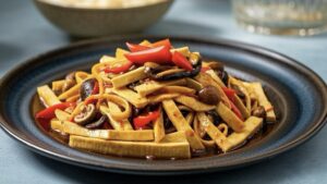 这是一道口感劲道、香辣入味的斋食菜肴,豆腐丝经过干煸处理,吸收调料香气,外焦里嫩。
