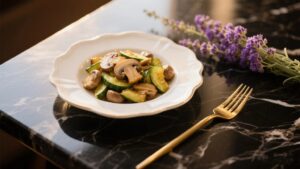 This is a light and flavorful vegetarian dish, combining the umami taste of straw mushrooms with the crisp tenderness of zucchini, quickly stir-fried to retain their natural flavors.
