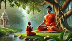 佛陀让小沙弥坐下,说道:「你要说的话我全都知道了,你师父的死我不是你的错。」