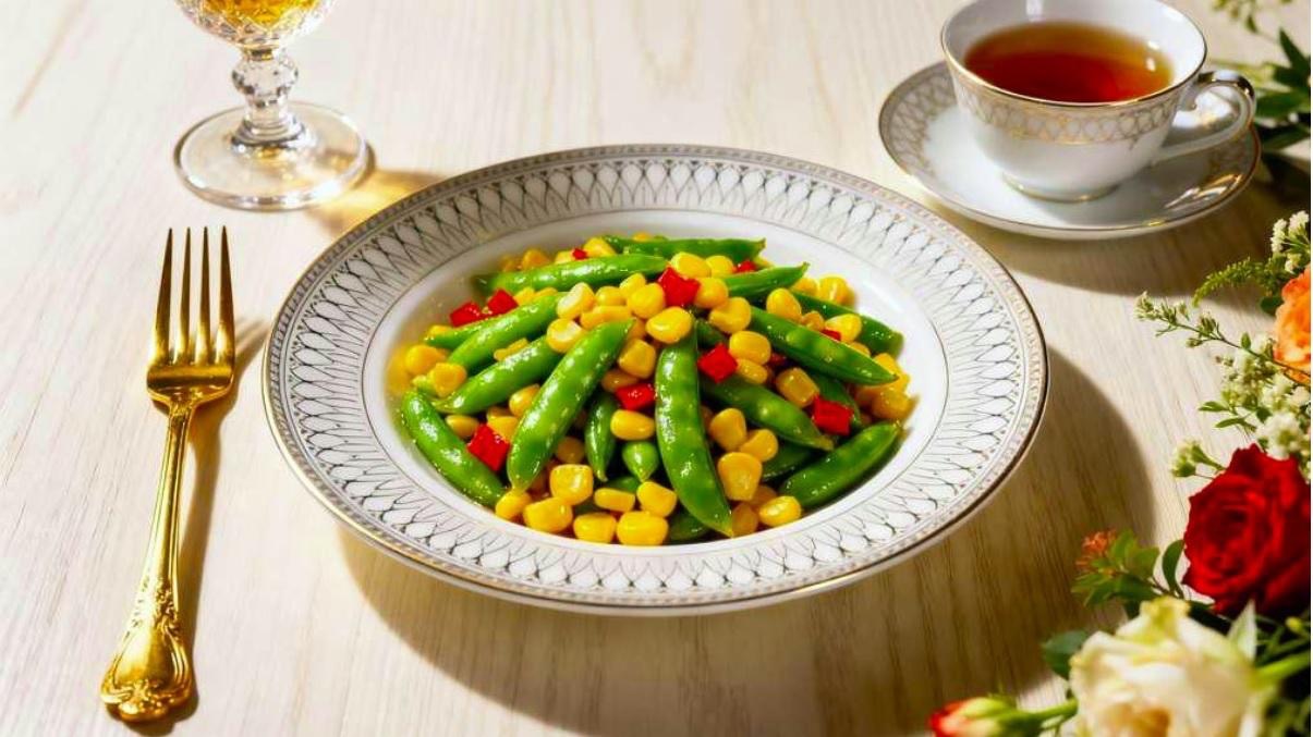 This is a vibrant and refreshing vegetarian stir-fry, combining the crisp texture of green peas with the natural sweetness of corn for a simple yet nutritious dish.