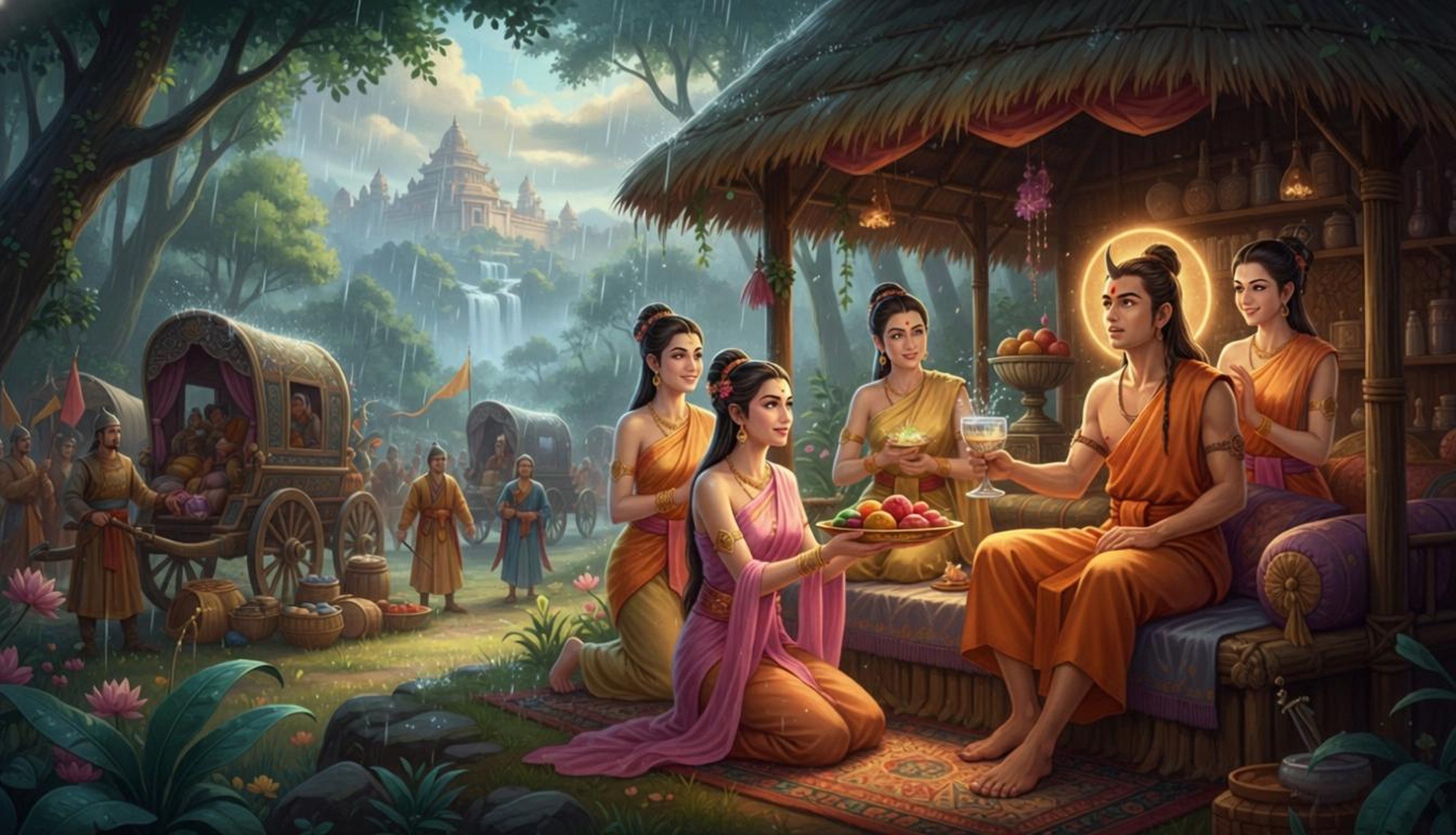 女子们对仙人说:「您何不住下来呢?」仙人回答:「当然可以住下来!」女子们提议:「我们可以一起沐浴!」仙人也同意了。碰触到女子们柔软的双手,仙人便动了欲心;再与她们一同沐浴,欲心转增,便有了淫欲的行为。仙人顿时失去神通,天空也下起了大雨。