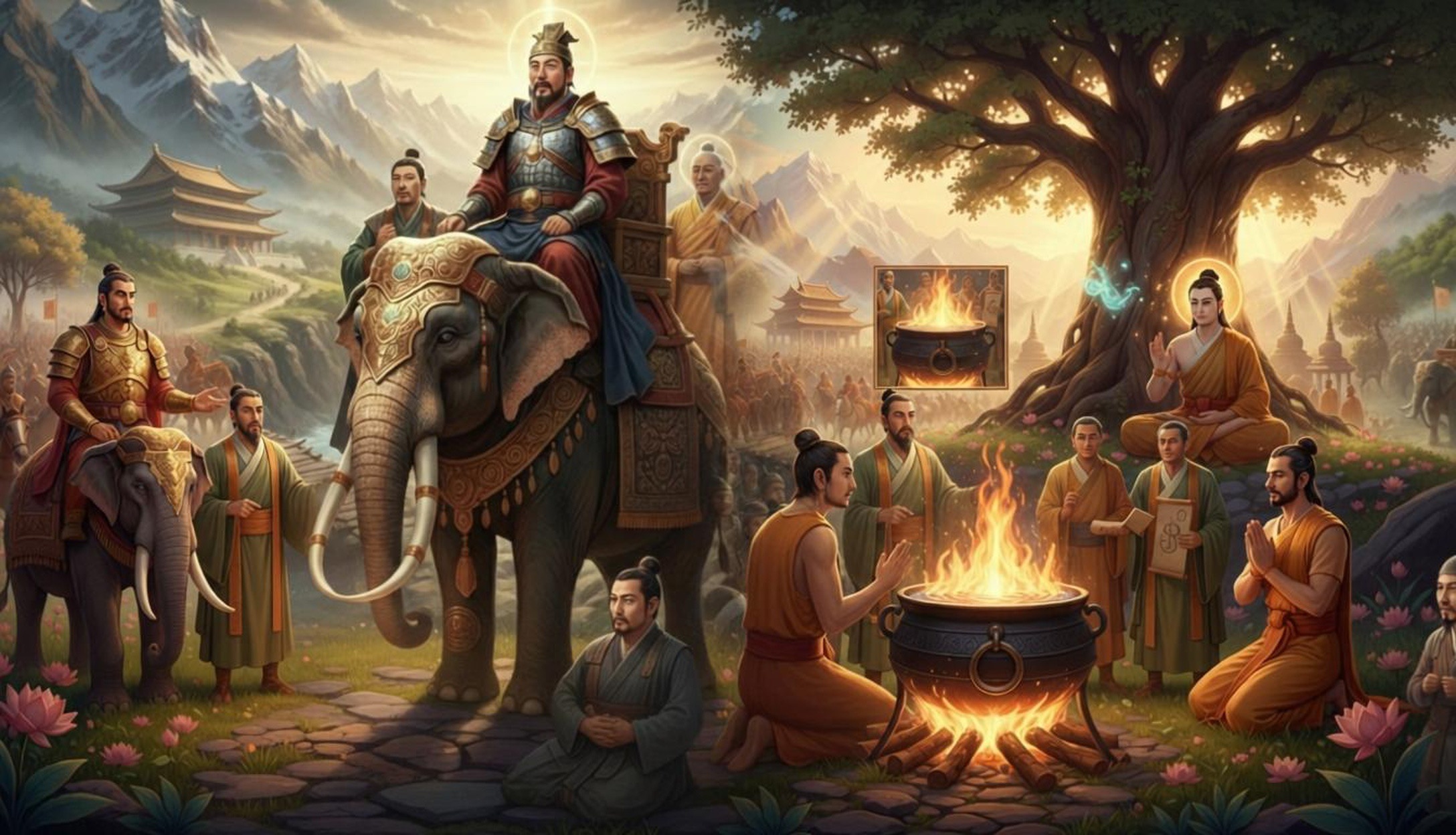 扇陀随即向国王要了五百辆车乘,载着五百位美女;又请求了五百辆鹿车,满载各种欢喜丸──这些丸子是以多种药材调制而成,彩绘装饰得像各种瓜果;同时还带了许多颜色清澈、味道如同清水的大力美酒。随后,她们披上树皮,穿着草衣,装扮成仙人的模样在山林间行走,并在一角仙人的草庵旁,也搭了一座草庵,就此住了下来。