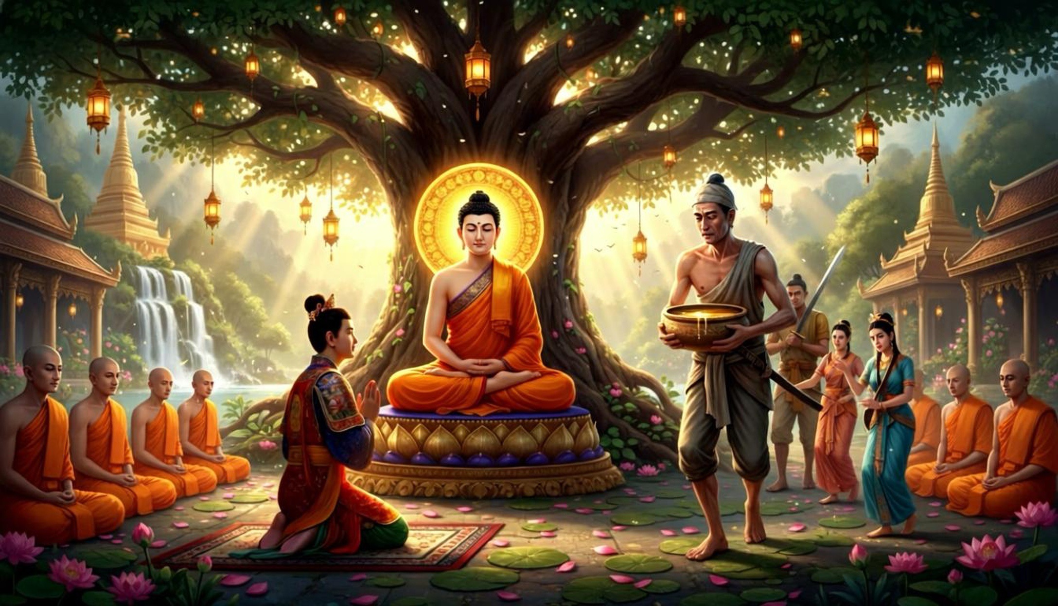 Knowing that the king was about to arrive, the World-Honored One soon appeared. A great assembly of disciples also manifested, gathering around the Buddha.