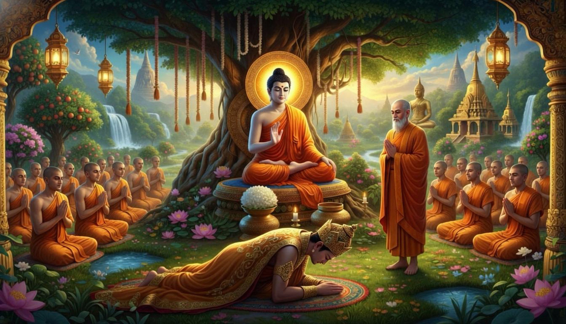 When the king reached the gate of the monastery, he felt great joy in his heart, so much so that the hairs on his body stood on end. At that moment, a sense of renunciation arose within him; no thought of craving remained.