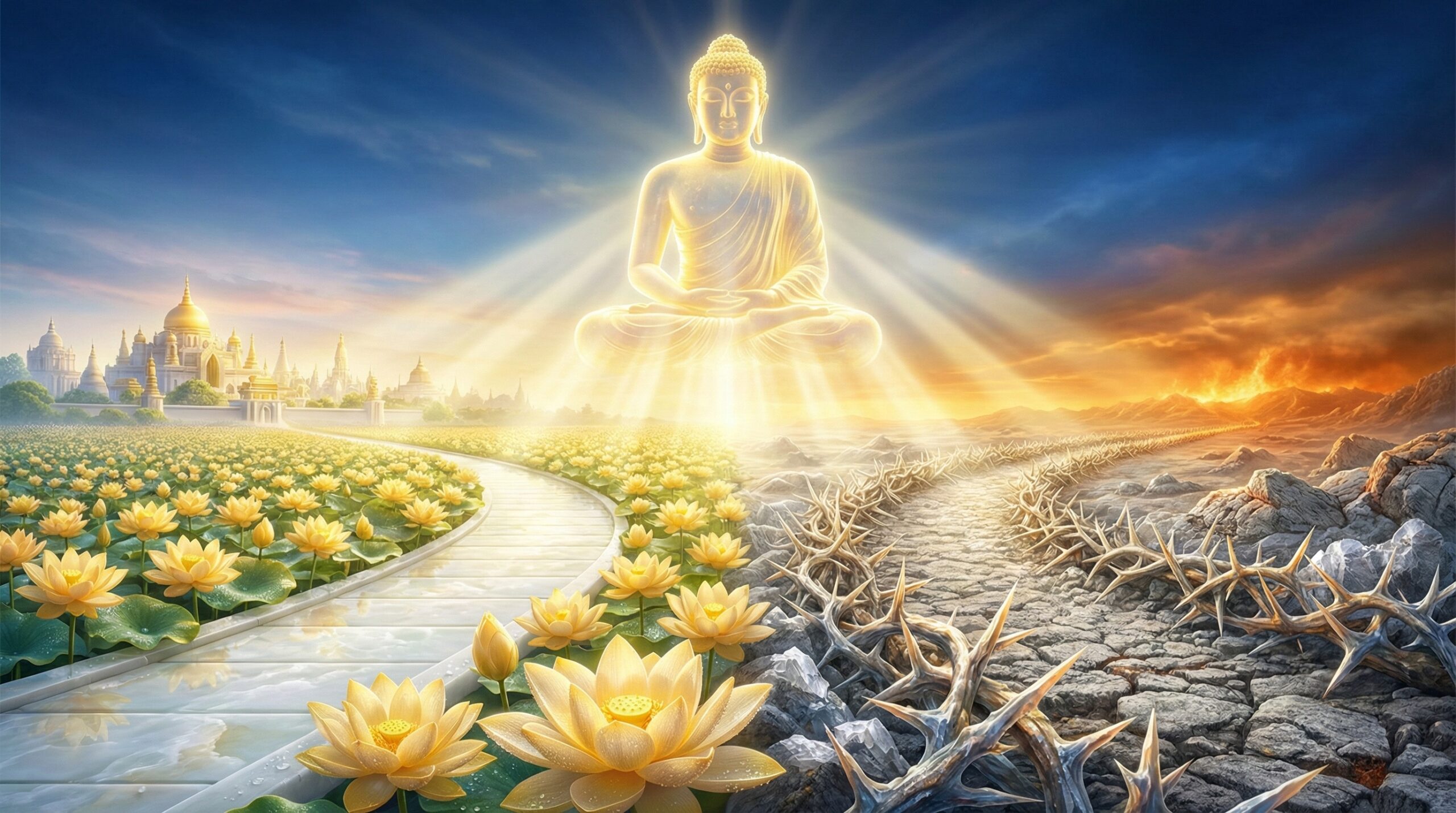 佛法进一步指出,善业与恶业本身并不能终结轮回。即便是善业,只要仍以“我”为中心、以存在延续为目标,仍属于条件性结果,终究会耗尽并转为新的不满足。因此,佛法并不以积累善业为终极目标,而是将其视为稳定心智、减少粗重烦恼的必要条件。