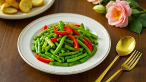 This is a simple and aromatic vegan stir-fry dish where green beans are cooked to a crisp texture with light seasoning, making it a flavorful and healthy home-style dish.