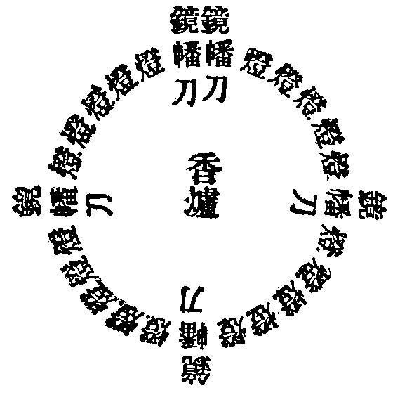五尺刀五口 五色幡五枚 箭二十一枚 灯二十一盏 镜五面 安息香 薰陆香 香汤泥地 外道咒牛屎泥地 芥子烧火中 恶鬼即身上火然 画作鬼像 石留枝鞭之 恶鬼口中血流