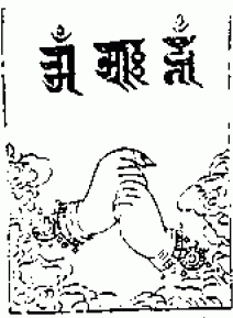 次结三宝印(左羽作拳。相竖力度当胸。右手握力度。心想诵真言)。